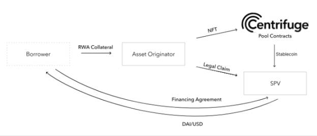 借款人(Borrower)可以将现实世界资产,通过资产发起人(Asset Originator)设立的 SPV,在 Centrifuge 的资产池进行代币化,从而能够获得链上投资者的稳定币资金。整个资产上链逻辑采用传统金融运行多年的资产证券化的逻辑,并通过 Centrifuge 资产池连接 DeFi 流动性。