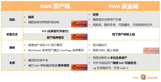 现实世界资产端的需求是融资,无论是通过 Security Token Offering 的方式,还是通过抵押借贷(Centrifuge)的方式。资产融资的本质没变,变的是获取的资本的来源——DeFi 的即时流动性,以及区块链和智能合约能够带来的,在融资渠道上面的降本增效(如 Centrifuge 协议)。