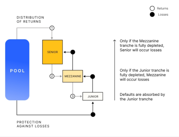 资产上链到了 Centrifuge 资产池之后,Centrifuge 资产池通过结构化产品的设计方式,为 DeFi 投资者引入不同风险级别、不同回报率的投资机会,投资者可以根据自己的风险承受能力和收益期望购买相应风险回报级别的产品。