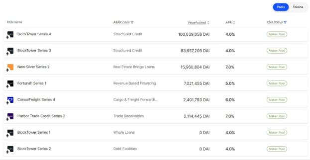 除了 Maker Pool 之外,我们还看到一些其他资产发行人的资产池,底层资产涉及船运发票、金融科技公司的预付款(Payment Advance)、库存融资、商业地产、消费贷款、应收账款、结构化信贷等等多种多样的私募信贷金融工具。