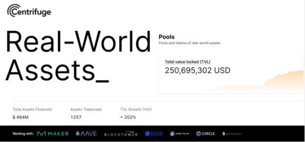 作为 RWA 市场的重要金融基建,Centrifuge 已经成为 RWA 私募信贷(Private Credit)的龙头(为 4.94 亿美元资产获得融资,目前 TVL 达到 2.5 亿美元),已经为 MakerDAO 创建了大量的 RWA 资产池,并与 Aave 一起推出 RWA 市场,共同与 BlockTower 将第一个信贷基金的运营带到链上。