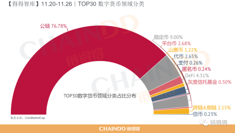其中占比最多的领域是公链,占比为 76.78%,排名第二的领域是稳定币,占比为 9.00%。TOP 30 数字货币领域分类的占比分布如下图所示: