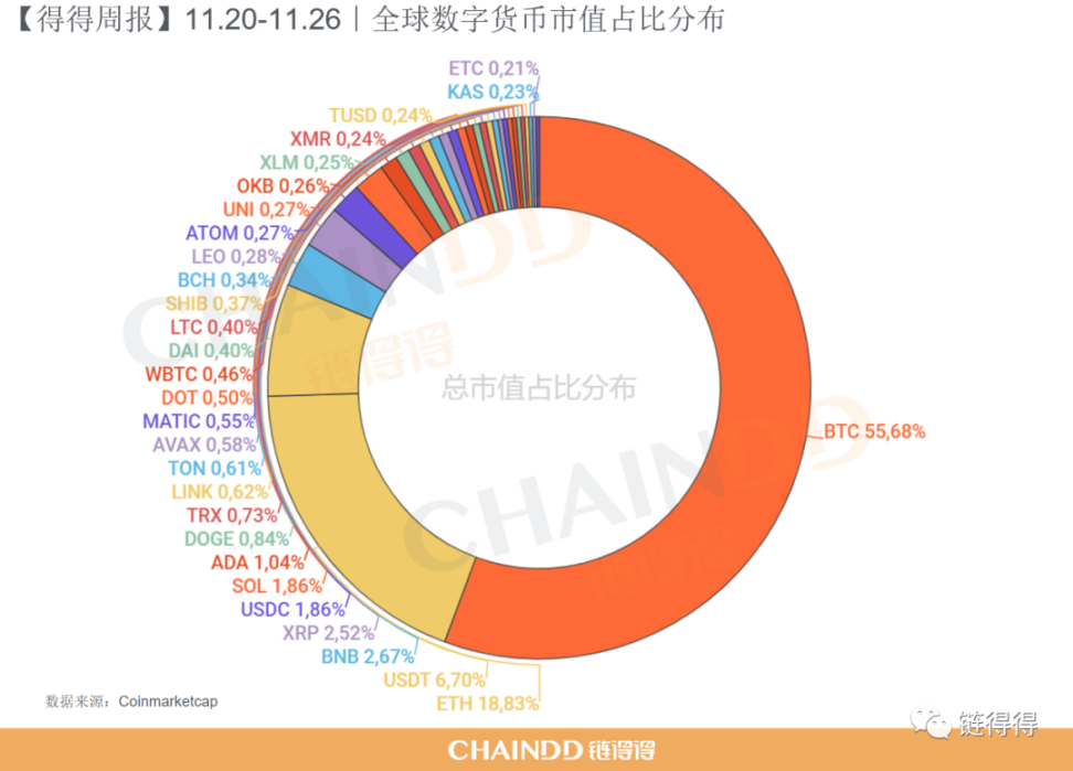 据得得智库数据统计,截止 2023 年 11 月 26 日 12:00,上周主流数字货币市场整体上行。