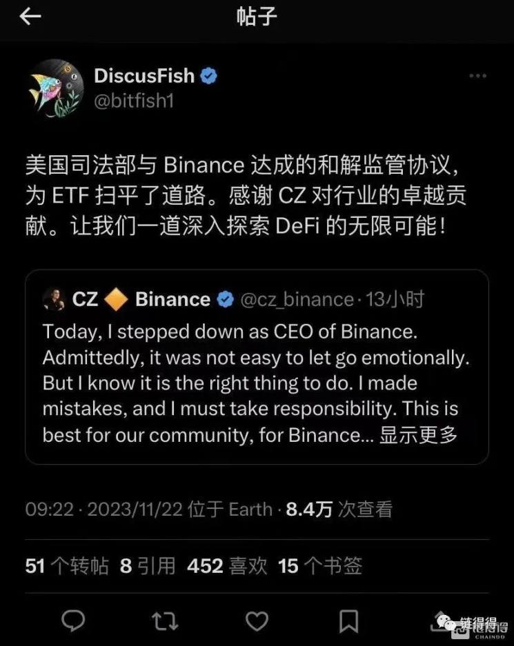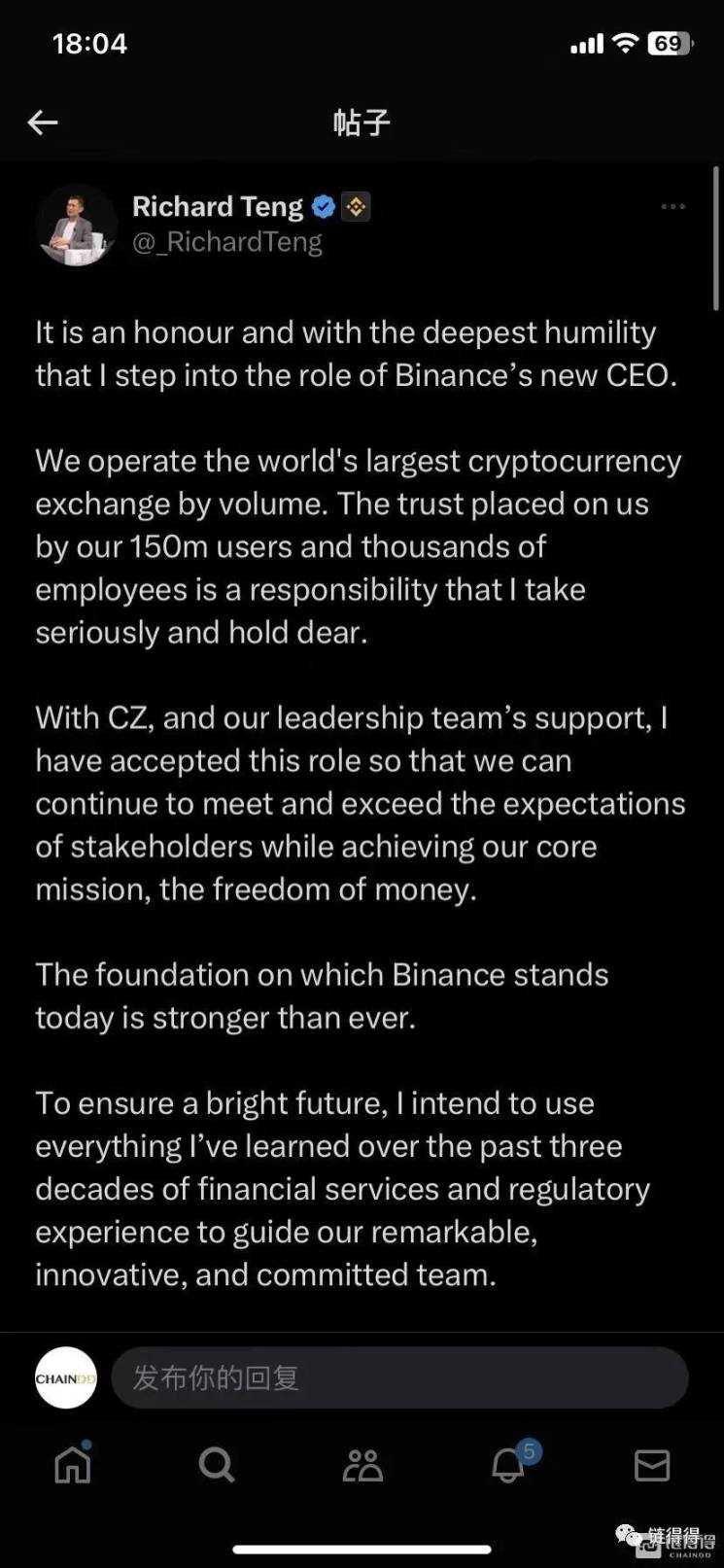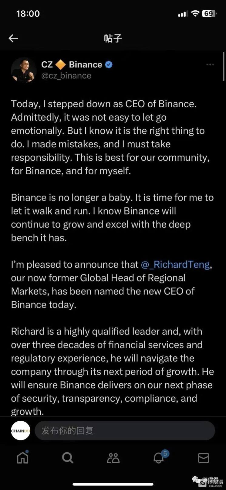币安创始人 CZ 宣布辞去 CEO 一职,据悉,其现在被禁止在币安担任执行职务,但也将被允许保留他在币安的多数股权。CZ 在社交媒体平台 X(前身为 Twitter)上写道,“我犯了错误,我必须承担责任”,“这对我们的社区、币安和我自己都是最好的。”与此同时,Richard Teng 将接棒出任币安 CEO。 据 GeekWire 披露消息,CZ 于当地时间周二现身西雅图法院并提出抗辩,检察官指控币安为受制裁组织的交易提供便利,并鼓励美国用户隐藏位置,以避免洗钱罪名。根据庭审记录,CZ 同意支付 5000 万美元的刑事罚款,并达成了认罪协议。CZ 个人的保释金为 1.75 亿美元,这也是史上最大的保释金之一。 法院判决 CZ 在等待判决期间将被允许居住在阿联酋。CZ 必须在宣判前 14 天返回美国。CZ 面临最高 10 年监禁,但根据认罪协议,预计刑期不会超过 18 个月,美国司法部尚未对他的监禁时长做出最终决定,辩护律师在法庭上表示,将推迟 6 个月宣判。其个人量刑听证会将于太平洋时间 2024 年 2 月 23 日 9 点(北京时间 2 月 24 日 1 点)举行,其认罪协议尚未公开,美国司法部也尚未决定他们将寻求对 CZ 判处多长时间的监禁。 今天,我辞去了币安的首席执行官职务。诚然,情感上放手并不容易。但我知道这是正确的做法。我犯了错误,我必须承担责任。这对我们的社区、对币安,以及对我自己都是最好的。币安已不再是个婴儿,是时候让它自己行走和奔跑了。我知道币安将在其深厚的基础上继续成长和变得卓越。 我很高兴地宣布,我们现任的全球区域市场负责人 Richard Teng 今天被任命为币安的新首席执行官。Richard 是一位高度合格的领导者,拥有超过三十年的金融服务和监管经验,他将引导公司进入下一个增长阶段。他将确保币安在安全性、透明度、合规性和增长的下一个阶段交付我们的承诺。在加入币安之前,Richard 是阿布扎比全球市场(ADGM)金融服务监管局的首席执行官;新加坡交易所(SGX)的首席监管官;以及新加坡金融管理局的企业融资主管。有了 Richard 和整个团队,我相信币安和加密行业的美好日子还在前方。 接下来我会怎么做?我会先休息一下。在过去的六年半时间里,我没有真正(手机关机)休息过一天。之后,我目前的想法是,我可能会进行一些被动投资,成为区块链 /Web3/DeFi、人工智能和生物技术领域初创公司的少数代币持有人 / 股东。我很高兴终于有更多时间来关注 DeFi。币安新上任的 CEO,CZ 的继任者 Richard Teng 也发布公开信表示:我们运营着全球最大的加密货币交易所,按交易量计算。我们的 1.5 亿用户和成千上万员工对我们的信任是我认真对待并珍视的责任在 CZ 和我们领导团队的支持下,我接受了这个角色,以便我们可以继续满足并超越利益相关者的期望,同时实现我们的核心使命——货币自由。币安今天所依托的基础比以往任何时候都更加坚实。 向用户保证,他们可以继续对公司的财务实力、安全性和安全性保持信心;与监管机构合作,全球范围内维护促进创新的高标准,同时提供重要的消费者保护;随着 CZ 时代的落幕,Coinbase 首席执行官布莱恩·阿姆斯特朗(Brian Armstrong)周二表示,币安 CEO 赵长鹏辞职,是该行业开启新篇章的机会,他表示相信美国将很快出台监管规定。 神鱼在 X 平台发文表示,美国司法部与币安达成的和解监管协议,为 ETF 扫平了道路。感谢 CZ 对行业的卓越贡献。愿与 CZ 一道深入探索 DeFi 的无限可能。
