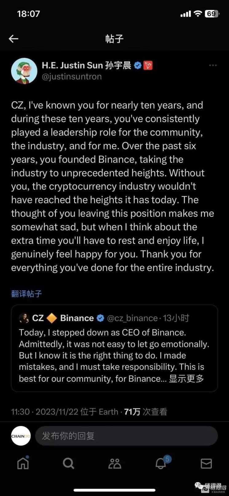 孙宇晨在 X 平台转发 CZ 的辞职声明并表示:“CZ,我认识你将近十年,这段时间里你一直在社区、行业以及对我来说扮演着领导角色。在过去的六年里,你创办了币安,将整个行业推向了前所未有的高度。如果没有你,加密货币行业不可能达到今天的高度。想到你离开这个职位让我有点难过,但当我想到你将有更多的时间休息和享受生活时,我真心为你感到高兴。感谢你为整个行业所做的一切。”