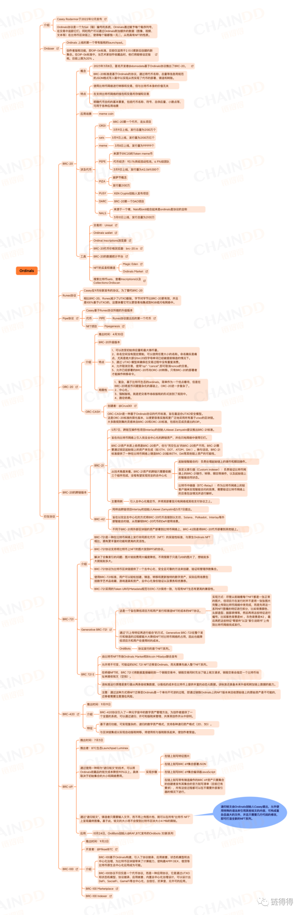 2022 年 12 月,Casey Rodarmor 推出了 Ordinals 协议。这是一个为 Sat(聪)编号的系统,Orninals 通过赋予每个聪序列号,在交易中追踪它们,同时用户可以通过 Ordinals 附加额外的数据(图像、视频、文本等)在比特币区块链上,使得每个聪都独一无二,从而具有 NFT 的性质。