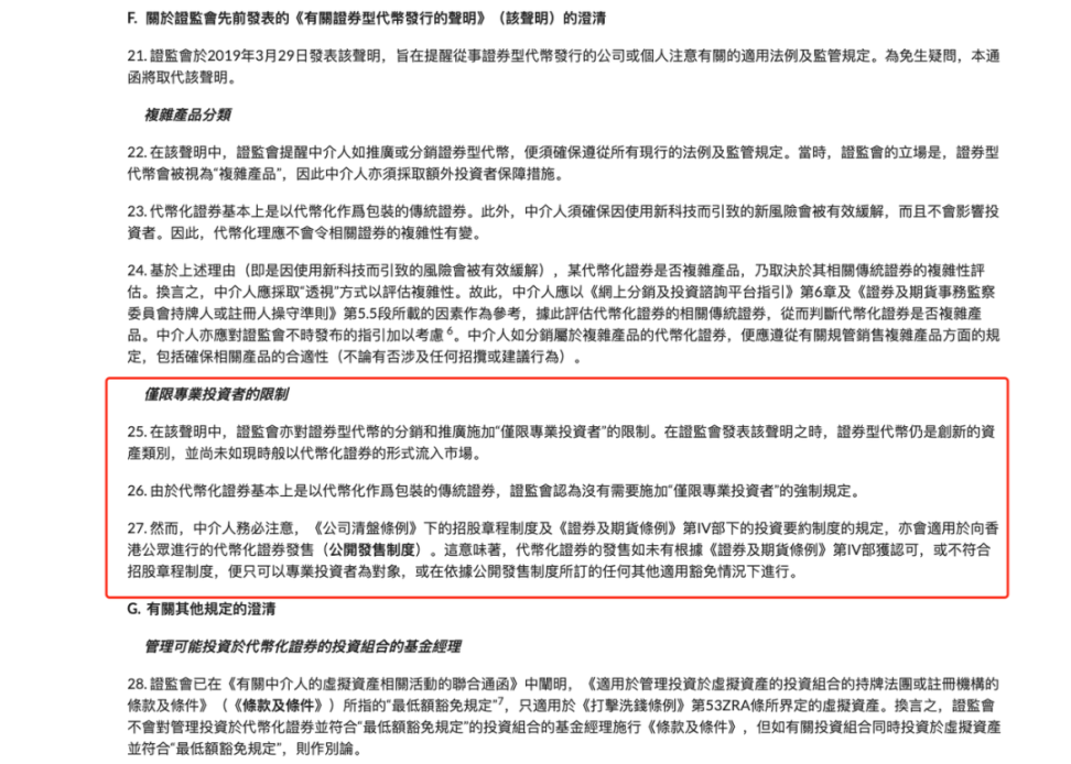 不过,11 月初香港证监会发布的《有关中介机构从事代币化证券相关活动的通函》释放出了积极信号,即代币化证券的发售不仅限于专业投资者。这意味着在满足监管要求的前提下,香港现阶段是允许代币化基金等产品公开面向零售投资者发售的。