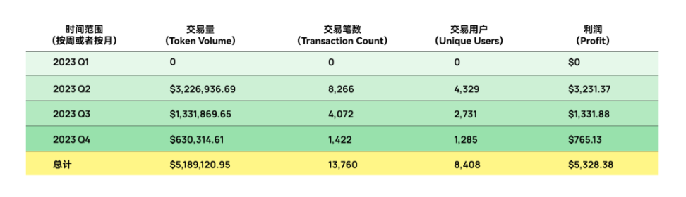 我们把这些数据整理在表格中,可以直观感受到:DODO Swap Widget 不仅帮助 DAO Maker 提高了业务效率,也为其带来了实质性的经济收益。从 2023 年开始,DAO Maker 通过使用 DODO Swap Widget,从第一季度的 $0 利润到第四季度累计到 $5,328.38。