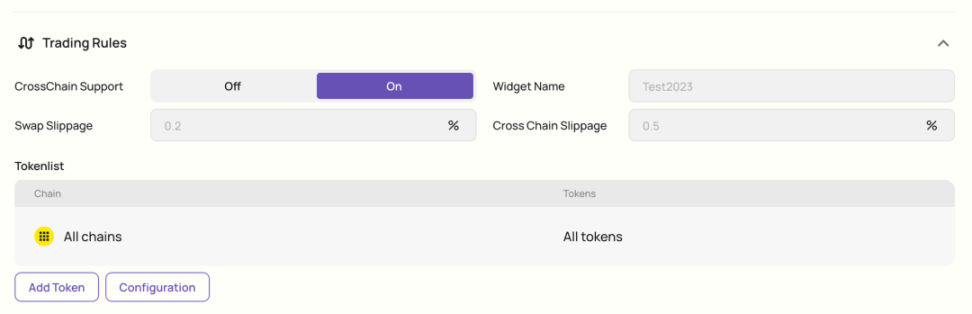 仅需简单注册后,即可轻松对 DODO Swap Widget 进行定制。交易配置包含:是否支持跨链交易、小组件的命名、默认的交易滑点、交易可选的代币列表。