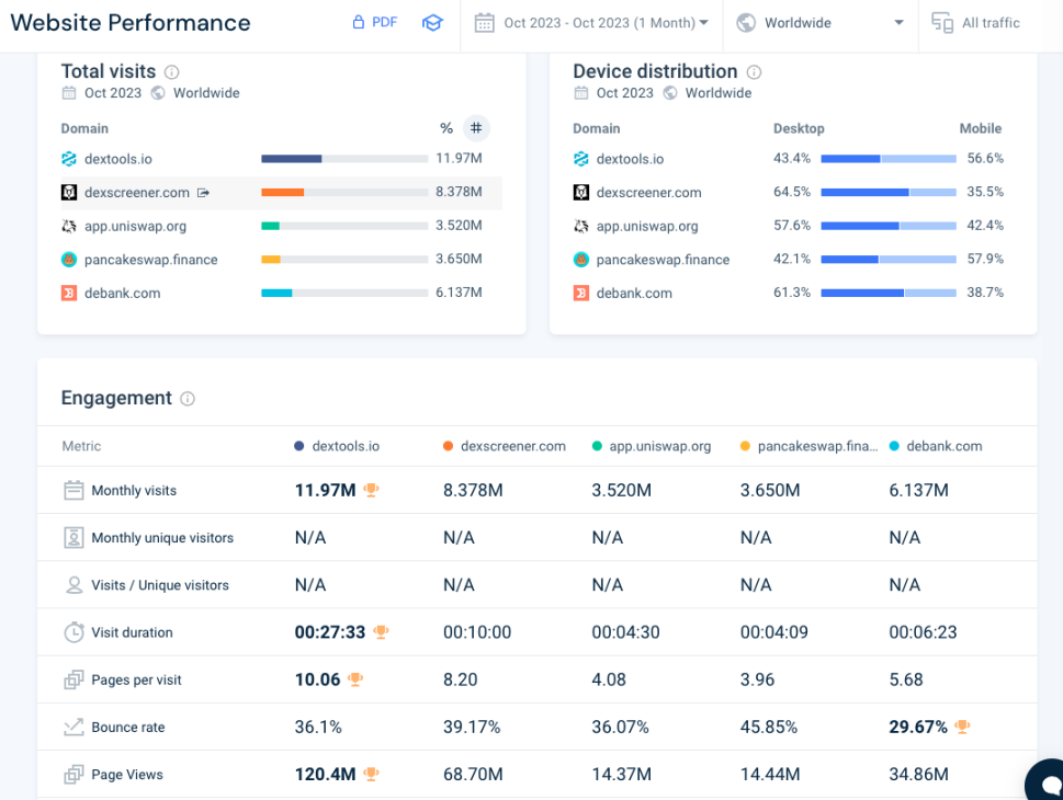 线图网站、头部 DEX 以及资管网站前端网站月访问数据 Source: https://pro.similarweb.com/#/digitalsuite/websiteanalysis/overview/website-performance/*/999/1m?webSource=Total&key=dextools.io,dexscreener.com,app.uniswap.org,pancakeswap.finance,debank.com