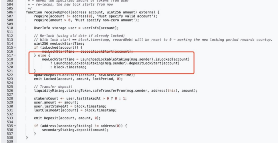 2023 年 11 月 6 日,跨链融资平台 TrustPad 的一项质押合约遭到攻击,损失约 15.5 万美元。11 月 9 日,TrustPad 发布攻击事后分析,说明此次攻击是因为 receiveUpPool 函数没有验证 msg.sender,使得攻击者能操纵 newlockstartTime。攻击者反复调用 receiveUpPool() 和 withdraw() 来收取奖励,然后调用 stakePendingRewards 将奖励转换为质押金额。最后,攻击者通过 withdraw() 撤回奖励。