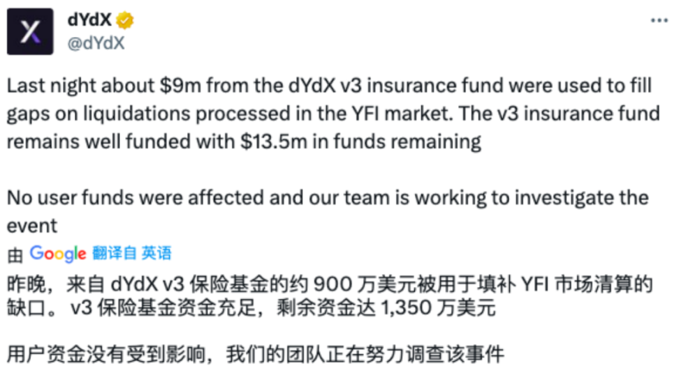 2023 年 11 月 18 日,dYdX v3 保险基金因 YFI 清算损失约 900 万美元,CEO 称遭针对性攻击。