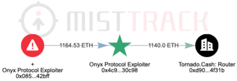 2023 年 11 月 1 日,DeFi 借贷协议 Onyx Protocol 遭攻击,损失 1,164.53 ETH,约 210 万美元。据慢雾安全团队分析,攻击者的手段与攻击 Hundred Finance 的手段相同,都是通过操纵利率的方式借入超出预期的资金实现攻击。据 MistTrack 分析,被盗资金已被转入 Tornado Cash。