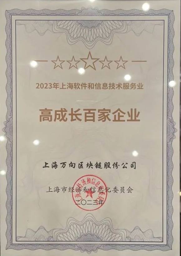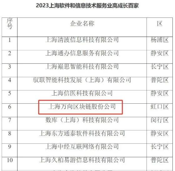 近日,上海市经济和信息化委员会公布了 2023 上海软件和信息技术服务双百名单,万向区块链荣幸入选“2023 上海软件和信息技术服务业高成长百家”。