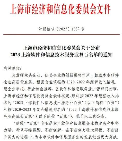 该榜单按 2020-2022 年复合增速排名,经企业申报、行业协会推荐、区软件和信息服务业主管部门初审、上海市经济和信息化委员会最终核定,旨在发挥龙头企业、优势企业的创新引领作用,鼓励本市软件企业高质量发展。