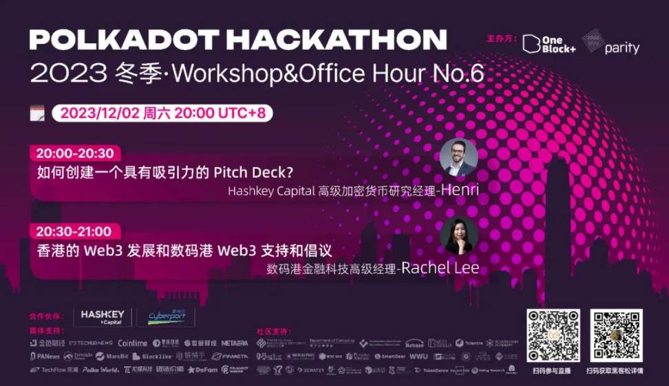 为了帮助参赛者更好地备战比赛,收获更多赛程活动的干货资讯,2023 冬季波卡黑客松大赛赛前指导 Workshop & OfficeHour 将以线上直播活动的形式展开。每期都将邀请波卡生态的明星项目核心专家来到活动现场与大家分享开发实战经验、共享波卡生态最新技术热点,帮助每位参赛者在第一时间了解技术关键点和赛事细则,助力开发者顺利构建自己的创意想法!