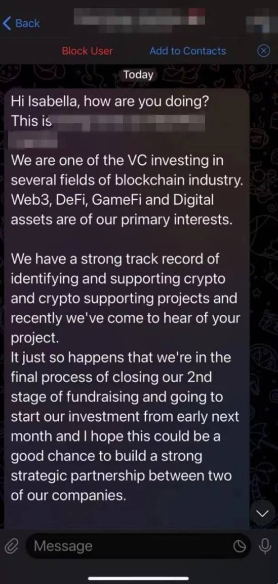 二、寻找知名的 DeFi 项目方作为目标,以要投资他们为名,使用虚假帐号开始实施骗局:
