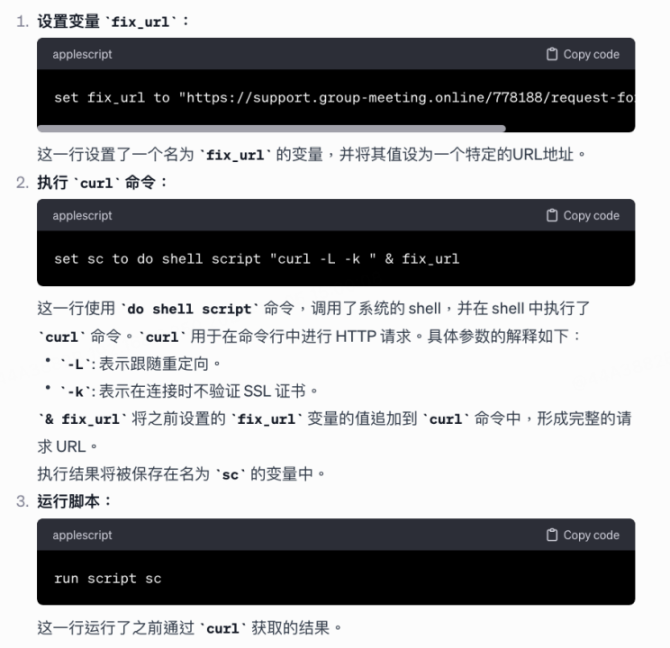 1. 邀请项目方加入如 ***.group-meeting.team 之类的会议,假装询问对方是否有时间安排会面或详谈,并主动提供恶意会议链接。项目方点击链接后会看到地区访问限制,这时朝鲜黑客会接着诱使项目方下载并运行其提供的“修改定位”的恶意脚本。一旦项目方照做,那么他的电脑就会被朝鲜黑客控制,导致资金被盗取。下面是恶意脚本 IP_Request.scpt 的内容: