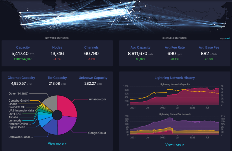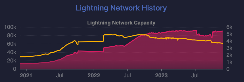 闪电网络(Lightning Network)是一种基于比特币的二层扩容解决方案,与比特币的主区块链分开,它通过在链下建立点对点的支付通道来实现快速、低成本的交易。通过支付通道进行交易,并最终在主区块链上结算。比特币的主区块链每秒只能处理大约七笔交易,而一些主流信用卡经常处理超过 1,000 笔每秒的交易。与主链上的交易相比,闪电网络上的比特币交易往往成本更低。通过建立支付通道来实现快速和廉价的交易。用户可以在闪电网络中建立支付通道,在通道内进行多次交易,然后在完成后将聚合的交易记录在比特币区块链上。闪电网络由一组处理支付的节点组成,交易通常使用 QR 码进行,而不是复杂的公钥。闪电网络可以实现数千甚至数十万笔交易的即时完成,从而使小额交易成为可能。闪电网络的概念最初由比特币的匿名创造者中本聪(Satoshi Nakamoto)提出,但由研究人员 Joseph Poon 和 Thaddeus Dryja 在 2016 年的一篇白皮书中正式提出。自 2018 年以来,闪电网络已经得到了多个团队的开发和推广,包括 Lightning Labs、ACINQ 和 Blockstream 等。1. Alice 和 Bob 都将一定数量的比特币存入渠道。2. Alice 将一个哈希时间锁合约(HTLC)发送给 Bob。3. Bob 在 HTLC 中指定一个时间戳和一个赎回地址。4. Alice 可以随时向 Bob 发送交易,交易金额将从 Alice 存入的渠道中扣除。5. Bob 可以将 HTLC 赎回,将交易金额从渠道中转移到自己的账户。其中时间锁 CheckSequenceVerify(CSV)是单向支付渠道中使用的一种防欺诈机制。它允许 Alice 和 Bob 在 HTLC 中指定一个时间戳,如果 Bob 在时间戳之前没有赎回 HTLC,Alice 可以将交易金额从渠道中转移到自己的账户。而双向支付渠道(Bi-Directional Payment Channel)是单向支付渠道的扩展。它允许 Alice 和 Bob 在同一渠道中进行双向交易。这个工作原理与单向支付渠道类似,只是 Alice 和 Bob 都将一定数量的比特币存入渠道,并且每个人都可以向对方发送交易。RSMC 可撤销顺序成熟度合约(Revocable Sequenced Maturity Contract)是双向支付渠道中使用的一种防欺诈机制。它允许 Alice 和 Bob 在渠道中指定一个赎回序列,如果一方违反了赎回序列,另一方可以将交易金额从渠道中转移到自己的账户。闪电网络由众多支付通道组成,支付通道之间可以相互连接,形成一个支付网络。用户可以通过支付网络进行快速、低成本的交易。但是闪电网络的技术相对复杂,有一定的学习和配置门槛。在安全性方面,闪电网络依赖于用户的操作,如果用户操作不当,则可能遭受资金损失,这些都是闪电网络生态发展面临的挑战。目前在 mempool 的记录上,有 13,746 个节点,通道数量为 60,790 个。闪电网络的通道数在过去的一两年并没有特别数量上的起伏,但 BTC 的 Capacity 相较于去年的三千多,增长到突破了 5,000 BTC。