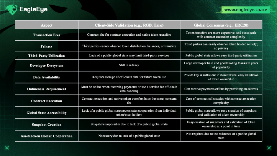 客户端验证是一种轻量级的验证方法,它属于 Layer 2 扩容解决方案的一种,允许用户在不下载整个区块链的情况下验证交易,这样用户可以链下进行交易,并由用户自己验证交易结果。目前,大部份的公链采用全局共识模型(Global Consensus),所有节点都需要验证所有交易,并且节点之间需要传输所有交易信息,从而共享全网统一的全局状态。这带来了几个问题。首先,它限制了系统的可扩展性,因为验证所有合约互动变得非常昂贵,特别是当网络规模增大和交易量增加时。其次,由于需要较高的计算和存储资源来处理和验证交易,会有相当高成本,从而阻止了更多的用户参与运行节点。随着时间的推移,节点集中化,降低了网络的去中心化程度和抵抗攻击力都有可能。同时,全局共识模型缺乏隐私保护,一位用户的交易信息都是公开的,所有参与节点都可以看到交易的详情,用户财务信息泄露或身份被暴露都有可能。因此,RGB 协议的设计初衷是为了解决传统全局共识模型所带来的一系列问题,特别是在可扩展性、节点集中化和隐私保护方面。下图我们列举了客户端验证,和全局验证的全方面对比,可供读者参考: