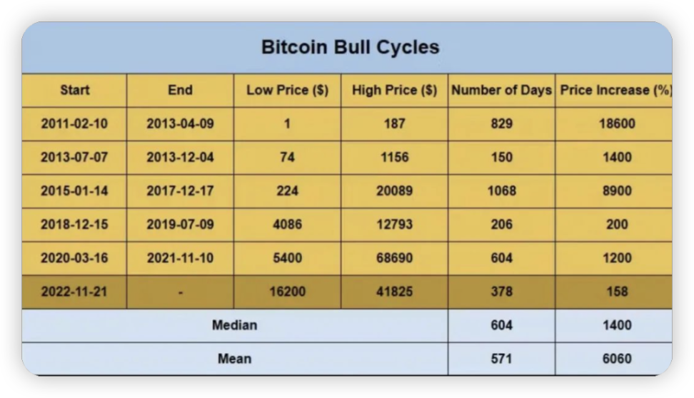 至于周期的持续时间,熊市周期的中位数持续时间为 354 天,平均持续时间为 293 天(近日的熊市周期持续时间也靠近 354 天)。对于牛市周期,中位数持续时间为 604 天,平均持续时间为 571 天。