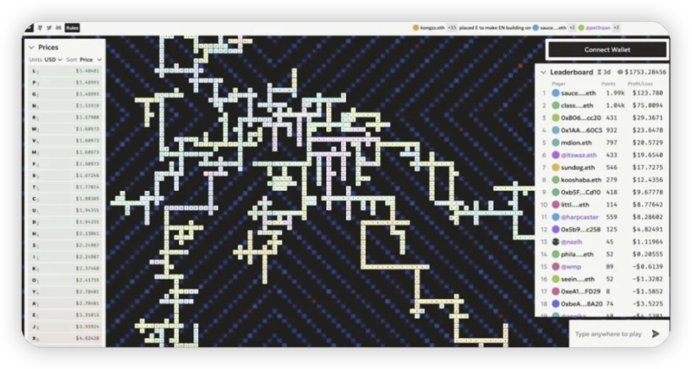 最后一个方向还是回到 fully on chain gaming,这个方向我之前提到过,想跟大家分享我看到的一个青年游戏天才开发者 Small brain——设计精巧的全链游戏的 Word3、Drawtech、Gaul。其背后的设计师,不但自己开发了许多出彩的玩法,创造出具有区块链特色的游戏,也凭借在 AW 社区中独到的观点输出,号召起一帮志同道合的开发者,在 mud 上迅速 iterate。他们朝着每隔六周推出一款新全链游戏的目标前进, 做出了许多有趣的实验。