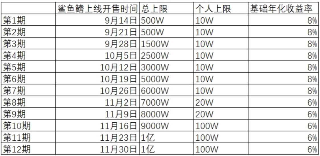 由图可以看出,火币 HTX 鲨鱼鳍产品的发售总额不断提高,最新一期发行上限为 1 亿 USDT,个人上限提升至 100 万 USDT。且基础年化收益率均保持在 6%~8%。据悉,每期鲨鱼鳍产品均在较短时间内售罄,用户接受度和参与热情很高。