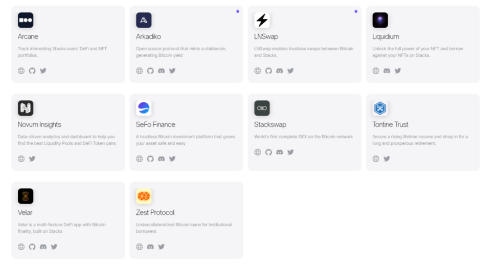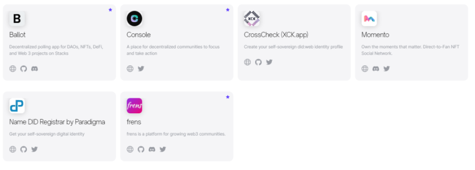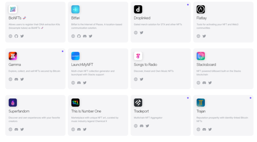 目前,Stacks 已经拥有了一系列垂直领域的产品、工具、项目、解决方案和实验,包括各类 DApp、钱包、NFT、Cryptocurrency、节点管理基础设施、社群等。2023 年 Stacks 上的工具应用和 DApp 尤其活跃,其中知名项目包括: