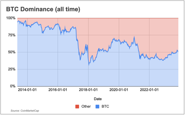 因此,我们看到了生态系统的爆炸式增长。虽然比特币的市值从数百万美元飙升至数千亿美元,成为世界上最受欢迎的品牌之一,并且可能有大型 ETF 正在酝酿中,但比特币的主导地位 ( 其在整个加密空间价值中的份额 ) 已经从大约 100% 大幅下降到 50% 左右。
