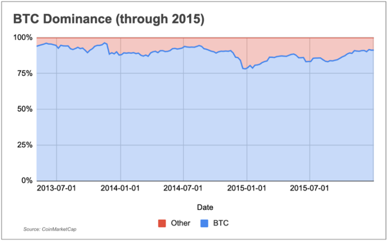 截至 2015 年 12 月 31 日,比特币占加密资产总市值的比例