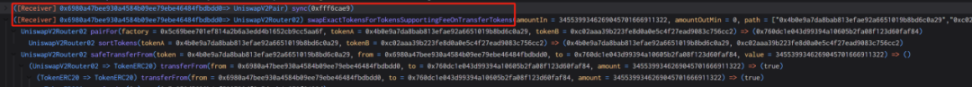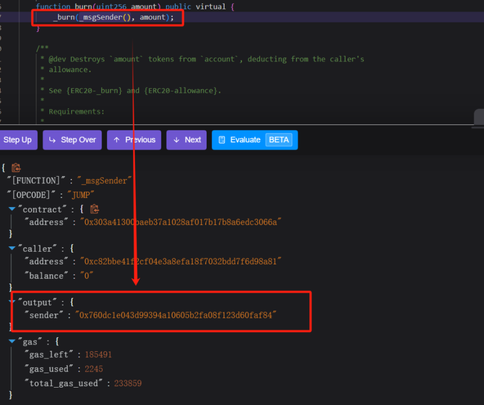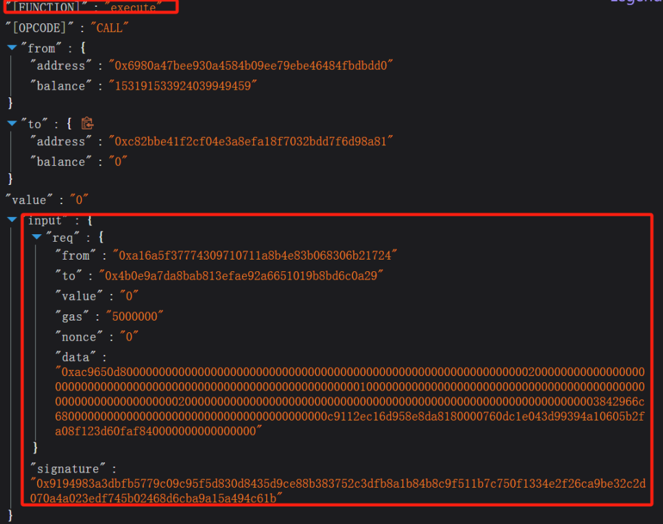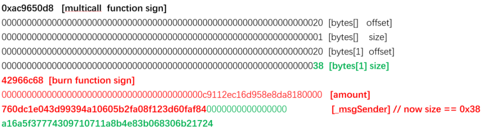 1.攻击者首先使用 5 个 WTH 兑换约 34.5 亿个 Time 代币作为准备资金。2.接着攻击者调用转发器的 execute 函数通过签名验证,并传入恶意的 calldata,如下3.此时 execute 函数会调用 req.to 地址(Time 代币地址),并将 req.data 和 req.from 地址打包并调用 Time 代币的 multicall 函数。那这里黑客是如何将 req.from 给舍弃的呢?原因在于黑客将 data[1]的长度(size)设置为了 0x38,那么 muticall 在解析 data 时 req.from 将被截断。