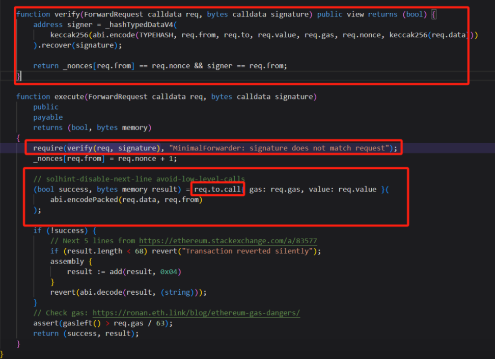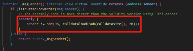 EIP 2771 协议为接收者合约定义了合约级协议,以通过可信转发器合约接受元交易。没有进行任何协议更改。通过附加额外的 calldata 向接收者合约发送有效的 msg.sender(称为 _msgSender())和 msg.data(称为 _msgData()),该协议设计的初衷在于让以太坊接受来自没有 ETH 来支付 Gas 费用的外部账户的调用。由于该设计的特殊性,其 msg.sender 正如其协议描述的那样是通过_msgSender() 函数获取的,该函数会会判断发起者是否为可信转发器,如果是,则将截取传入的 Calldata 的最后 20 个字节作为交易的发起者。