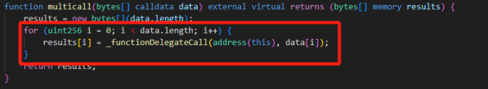 参考链接:https://eips.ethereum.org/EIPS/eip-2771https://etherscan.io/address/0x4b0e9a7da8bab813efae92a6651019b8bd6c0a29#codeMuticall 是一个由 openzeppelin contacts 提供的单个外部调用中批量处理多个调用的功能库。从 Time 事件中我们可以看见其 Multicall() 函数中将循环调用 DelegateCall 函数处理 Calldata 并调用本合约的其他函数。https://github.com/OpenZeppelin/openzeppelin-contractshttps://etherscan.io/address/0x4b0e9a7da8bab813efae92a6651019b8bd6c0a29#code