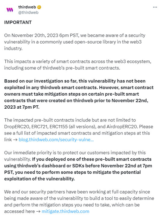 2023年12月07日,据Beosin旗下Eagle Eye平台消息,以太坊的TIME 合约遭受黑客攻击,黑客获利约18.8万美元。通过追踪溯源发现,我们发现在 2023 年 12 月 4 日,thirdweb 就在博客和官方发布漏洞公告称“2023 年 11 月 20 日,我们意识到 web3 智能合约常用开源库特定模式的集成存在安全漏洞,该漏洞影响了 Thirdweb 的一些预构建智能合约,并联系了相关项目方进行缓解。”https://twitter.com/thirdweb/status/1731841493407576247https://blog.thirdweb.com/security-vulnerability/12 月 7 日,以太坊的 TIME 合约,成为第一个因该安全问题受害的第一项目。