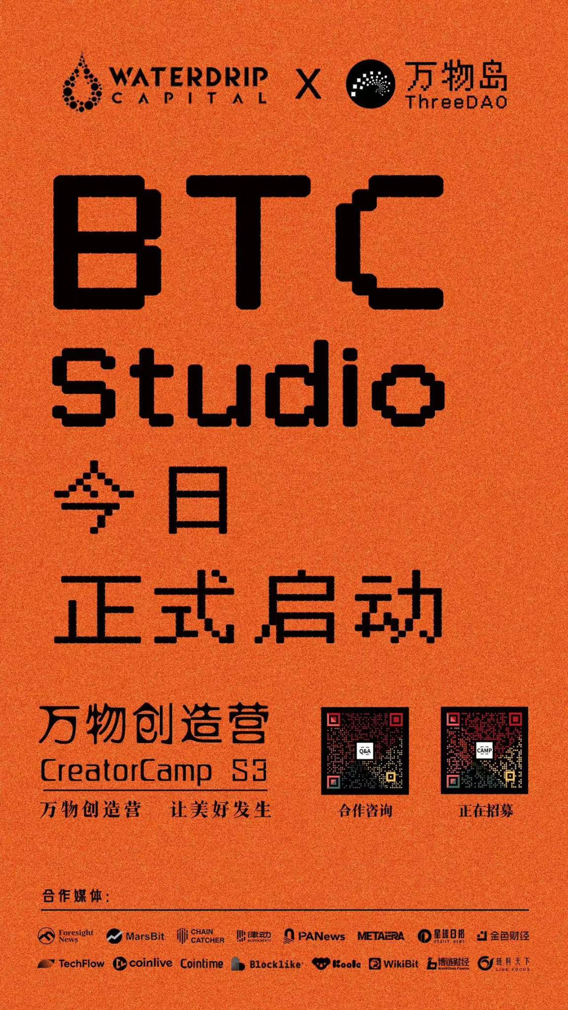 为助力华语创业者快速响应增量市场,水滴资本携手万物岛共建“BTC Studio”,全方面支持 BTC 生态建设者和创作者。BTC Studio 今日正式开启招募,所有入围创始人均可获得万物岛与水滴资本提供的为期 6 个月的创业辅导、融资服务及营销资源支持。