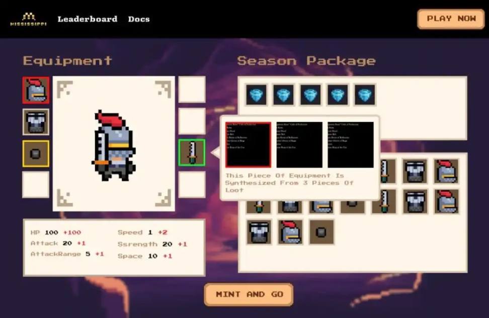 11. Mississippi • 项目特点与优势:大厂背景 /Loot 生态核心项目 • 游戏阶段:V1 版本已开放内测,可在 discord 报名,V2 版本预计 24 年 Q1 上线 Mississippi 是一个完全链上的肉鸽挖矿 + 真人对战游戏。玩家会进入到一个巨大的洞穴地图中,寻找随机生成的宝藏,并且将宝藏带出洞口。在这一过程中,玩家可以通过回合制战斗互相掠夺,争抢有限的资源。 在未来的版本中,玩家还可以通过收集宝藏来合成升级装备,获得更强的属性;在地图中建造和维护自己的矿山,有策略地调动资源;组成阵营联盟,合纵连横实现更复杂的目标。 Mississippi 和 Loot 生态深度结合,装备合成体系将会完全基于 Loot 和 Realms 的 NFT 设计。通过扩展 Loot 生态的资产、规则和世界观,Mississippi 会成为自治世界的探索先锋。Mississippi 曾获得 Realms 第 2 期 Grant 并在所有项目中排名第二,也得到 LXDAO、Mask Network 的资助。