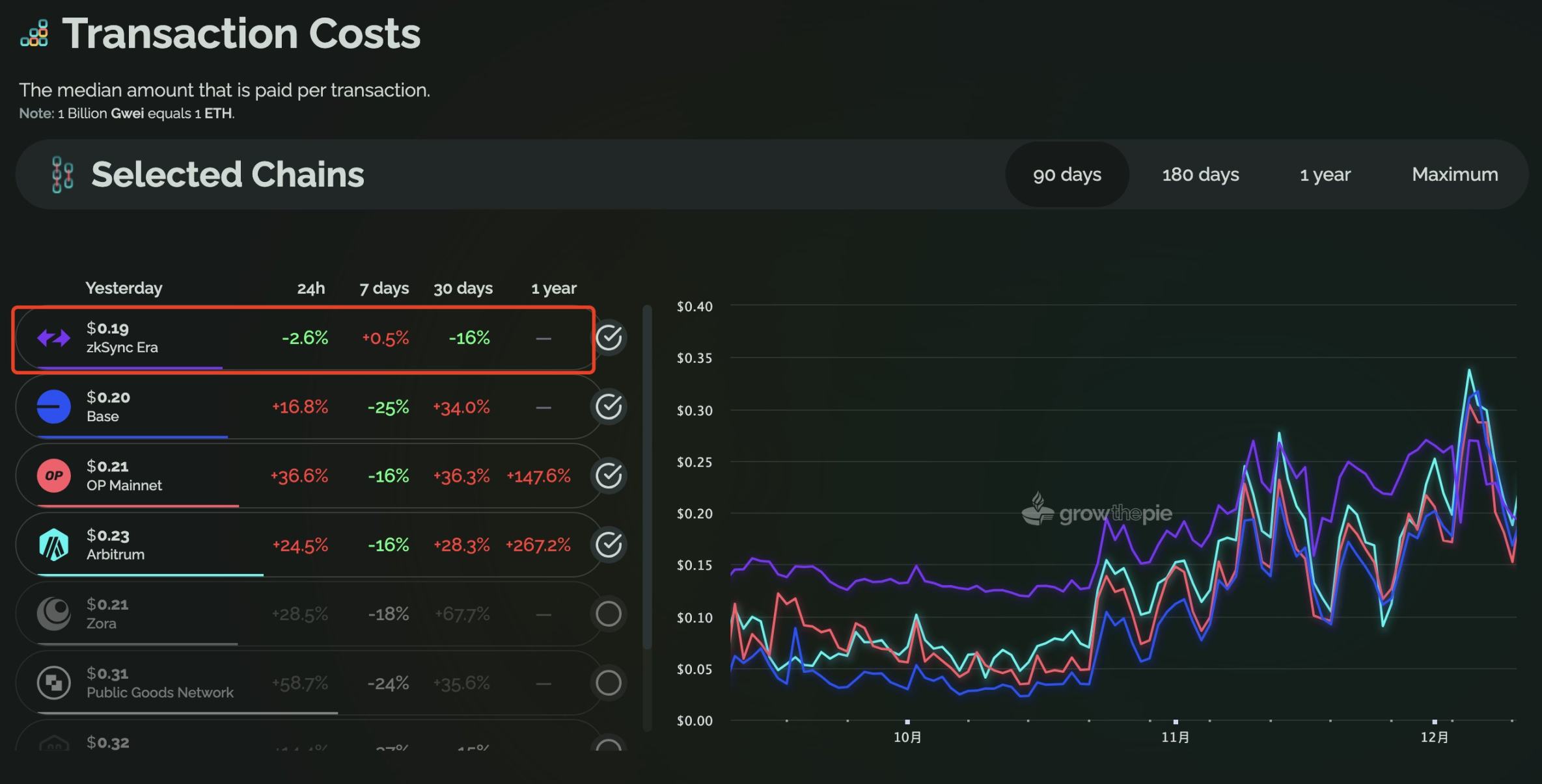 5)最近,zkSync 低调完成了 boojum 升级,同时集成了 STARK 和 SNARK 证明。(和我最早分析的判断一致),直接结果是,近 30 天,zkSync 的 Gas 费显著降低了 30% 左右,已经和 Arbitrum 达到了同一水平线。zkSync 原本就在用户体验上有优势,最近 Gas 费的下降会让其进一步获得更广的用户和流量。