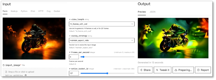 我们测试了第一种,因为它支持参数调整,操作也相对便捷:上传图片,调整帧数、画面纵横比、整体运动等参数即可。但美中不足的是,画面生成效果相对随机,需要不断调试来达到想要的效果。