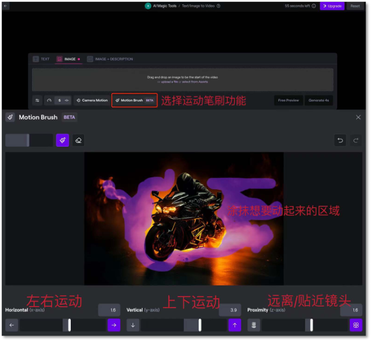 就在前几天,Runway 又上线了新功能「Motion Brush」(运动笔刷),我们只需在图像上涂抹一个区域,就能将静态的图像变为动态内容。「运动笔刷」的功能在操作上太友好了,选定一张图片,使用笔刷涂抹想要动起来的区域,再调试好想要大致的运动方向,静止的图片就可以根据预定动起来。