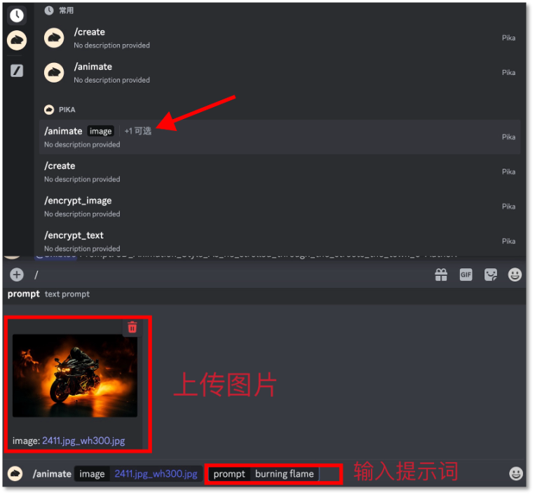 如果用图片生成视频,则输入「/」后,选择「animate」,上传一张图片,输入提示词说明即可。