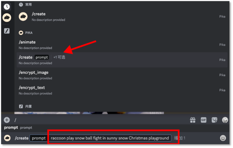 进入 Pika 1.0 的 Discord 服务器后,点击 Generat 中的任意一个频道,输入「/」,选择「Create」,在弹出的 prompt 文本框中输入提示词即可。