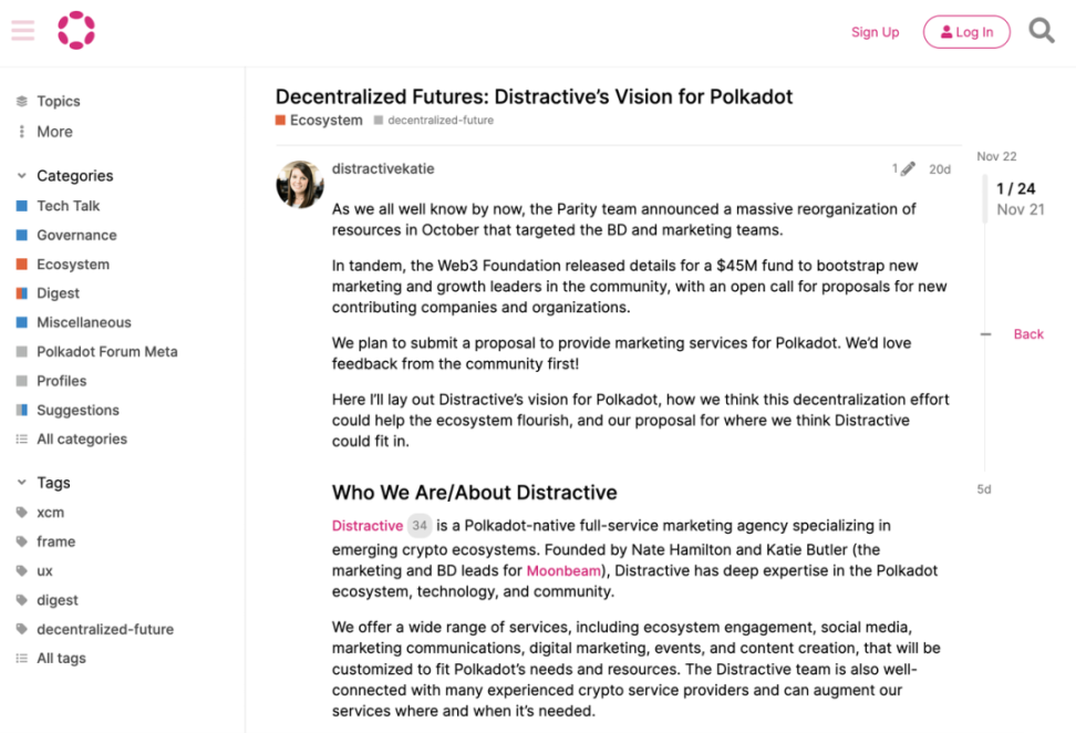 不久前,市场营销代理机构 Distractive 创始人之一 Katie Hamilton 在 Polkadot 论坛发帖,介绍其提出的新 Polkadot 营销方案,并向社区征集建议。Distractive 是 Moonbeam 团队的创始营销团队。