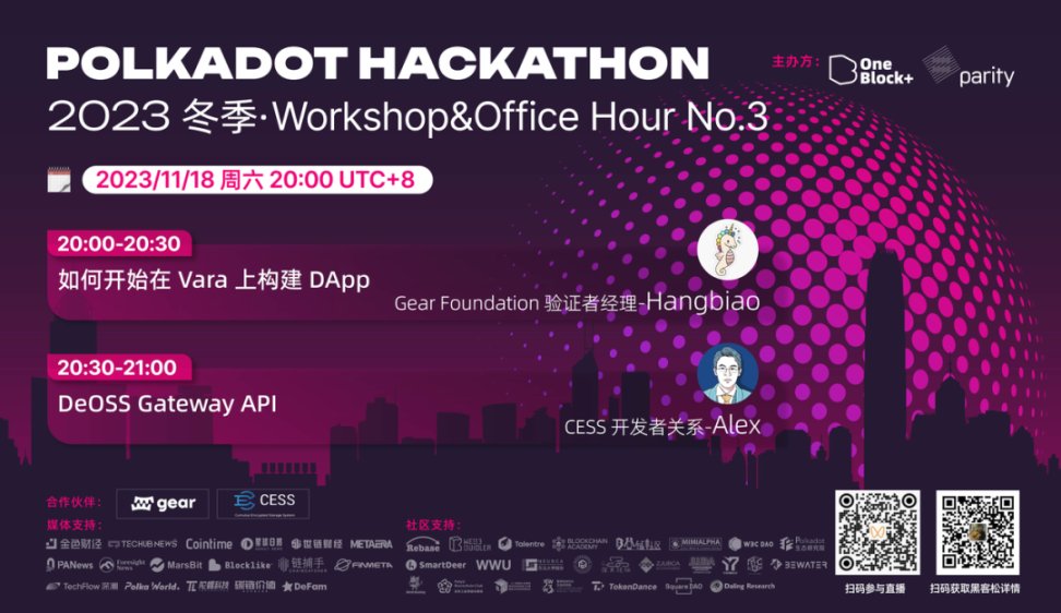 第 3 场 Workshop 于 11 月 18 日晚 20:00 举行,Gear Foundation 验证者经理 Hangbiao、CESS 开发者关系 Alex 与开发者探索如何开始在 Vara 上构建 DApp 的技术方法,洞悉 DeOSS Gateway API 的知识干货。