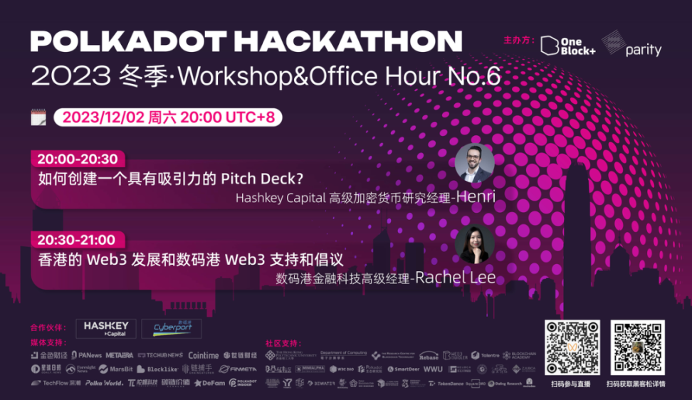 第 6 场 Workshop 于 12 月 2 日晚 20:00 举行,Hashkey Capital 高级加密货币研究经理 Henri、数码港金融科技高级经理 Rachel Lee 向大家分享创建一个具有吸引力 Pitch Deck 的重要性,了解香港 Web3 发展与数码港支持 Web3 的倡议。