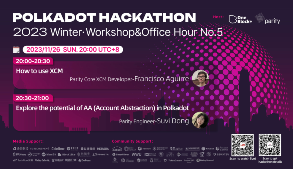 第 5 场 Workshop 于 11 月 26 日晚 20:00 举行,Parity Core XCM Developer Francisco Aguirre、Parity Engineer Suvi Dong 与海外用户共同分享了如何使用 XCM 跨链技术的方法,探索账户抽象(AA)在波卡生态应用的潜力。