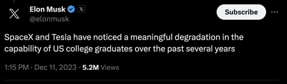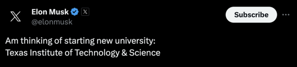 学校官方向美国国税局提交的文件曝光了这一则消息,学校当时在申请免税资格。文件显示,马斯克提供 1 亿美元(约 7.13 亿元)的种子轮资金,在美国德克萨斯州奥斯汀开设一所学校。学校将从小学和中学开始运营,并不断扩大规模,最后将创建一所大学,该大学会致力于提供最高水平的教育。这所学校会提供线下教学,也提供远程教育,整体的教育模式将以 STEM 为重点,也就是科学(Science)、技术(Technology)、工程(Engineering)和数学(Mathematics)。教学会强调这些学科的综合性,鼓励学生在解决实际问题时运用跨学科的知识和技能。并且,学校希望未来大学的课程能够结合数学、科学、工程和物理等学科经验丰富教师的正式教学,并提供模拟、案例研究、制造 / 设计项目、实验等在内的实践学习经验。也就是说,马斯克举办的这所学校将以理工科为重点,重理论的同时也将注重实践。学校的中小学第一年招生规模为 50 人,计划招募 22 名白种人、4 名非洲裔、6 名亚裔、16 名拉丁裔以及 2 名其他人种的学生。学校采用申请制,录取条件将以成绩为基础(不过没有说根据什么成绩),并对学生进行全面评估,将选择“表现出学术好奇心、纪律性、独立性和创新精神的申请人”,择优录取。并且学校承诺,“不保证任何委托人、管理人员、雇员或其他家庭成员被录取”,想入学只能依靠自己的成绩和长处。另外,如果学生被录取但是无力支付学费或其他费用,学校将在可用资源的范围内给学生提供学费和经济支持。学校正在申请美国南方大学和学院协会(SACSCOC)的大学认证,同时正在招聘执行董事、11 位教师以及 9 名行政人员。其实马斯克早在 2021 年就在推特上预告过,自己要开设一所大学,叫“德州科学技术学院”。结果这则官方文件流出,这所学校在 2022 年 10 月提交申请免税资格的表格,这意味着其实马斯克建学校、当时已经在筹划中。并且就在前两天,马斯克刚在推特上一顿炮轰美国教育。当时有一位用户痛批美国大学,认为美国的顶尖大学应该重新审视自己的核心优势,重建自己作为研究和学术中心的声誉。马斯克立刻表示赞同,回复道:“SpaceX 和特斯拉都发现了,过去几年美国大学毕业生的能力明显下降。”一位来自加拿大康考迪亚大学、拥有 30 年教龄的教授 Gad Saad 表示同意马斯克的观点。他评论道:我参加了一个会议,教授们说在疫情后让学生们整节课都坐着不动太痛苦了。对他们来说,考试太容易引起焦虑;记课堂笔记对他们来说太有挑战性。这不是培养学生的方法,无限的溺爱从来都不是正确的。学生必须被教导要反脆弱,要有上进心和求知欲,致力于批评性思维等等。”
