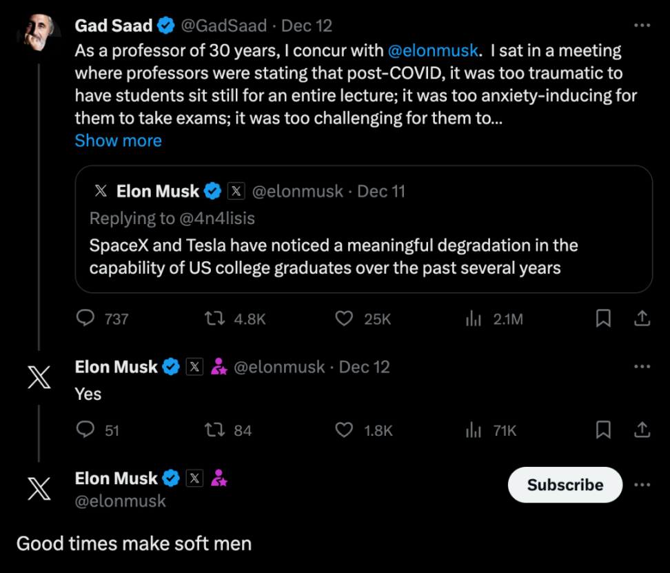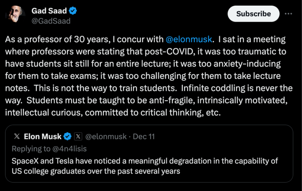 马斯克也同意了这位教授的观点,并表示:“顺境使人软弱。”