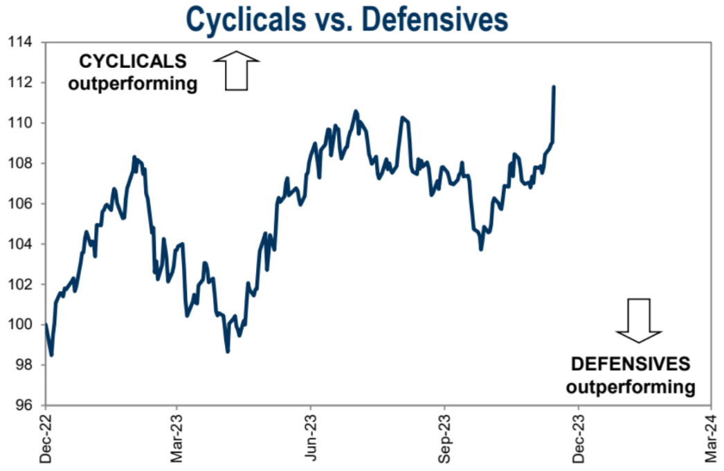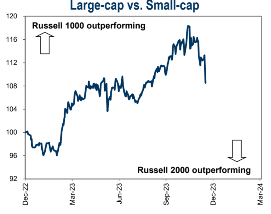 因为 12 月 1 日,鲍威尔还警告市场“现在猜何时开始宽松太早了”,而在 12 月 13 日的新闻发布上却称“开始讨论降息的问题”,所以这个鸽派转向是超出市场预期的,上周美股道指、纳斯达克 100 均创历史新高,标普 500 距离历史新高仅一步之遥。小盘代表罗素 2000 指数上周大涨 5.7% 距离历史高点仍相距 15% 以上。