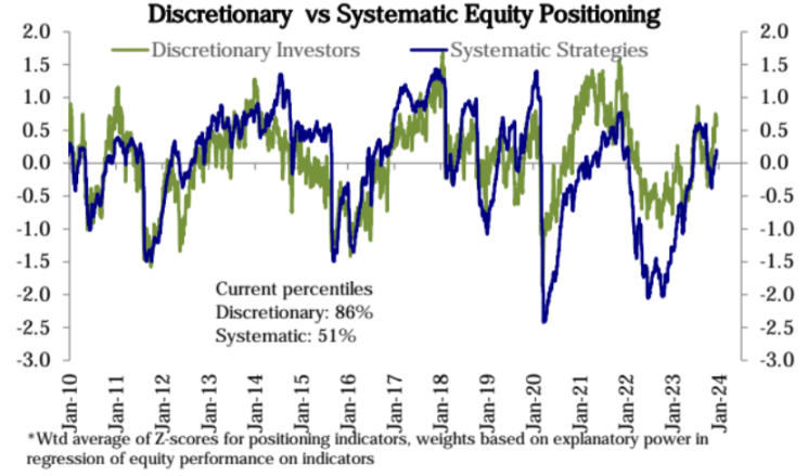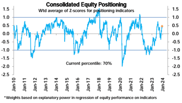 德意志银行的总股票头寸衡量指标本周再次上升,进一步进入超配区域(z-score 0.46,第 70 个百分位),高,但尚不极端
