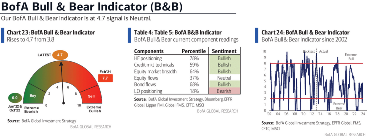 美国银行牛熊指标达到自 14 个月前牛市开始以来的最高水平,尽管远未达到极端抛售区域: